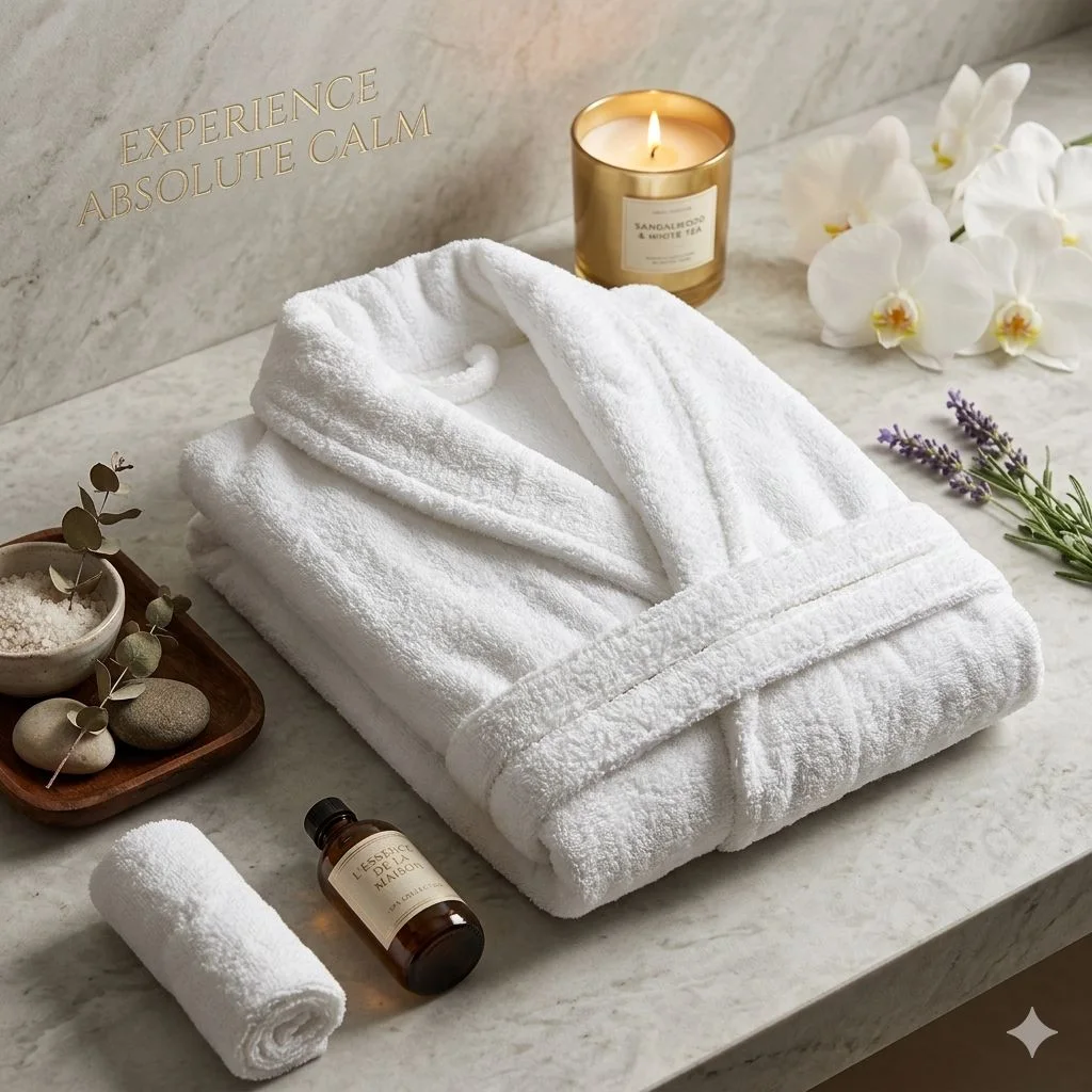 pack 5 pcs complet blanche ( Peignoir de bain + 3 serviette de bain + pantof)
